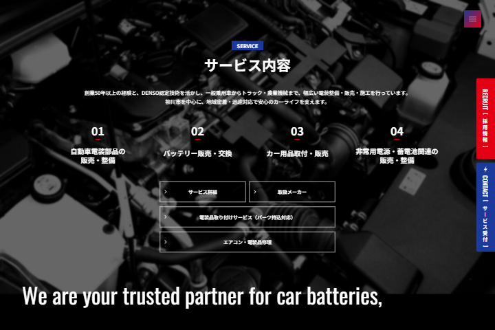 今回の制作では、バッテリー・電装品・非常電源に関する多様なサービスを用途別に整理し、訪問ユーザーが直感的に必要な情報へたどり着けるよう構成しました。