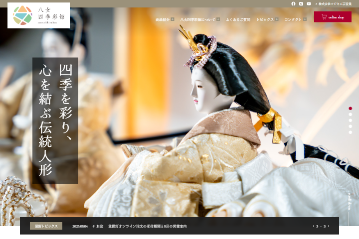 当社コメント雛人形・五月人形・正月飾り・盆提灯・和風ギフトなど、日本の四季・伝統文化を彩る製品を扱っておられる老舗、八女四季彩館様のウェブサイトを制作させていただきました。