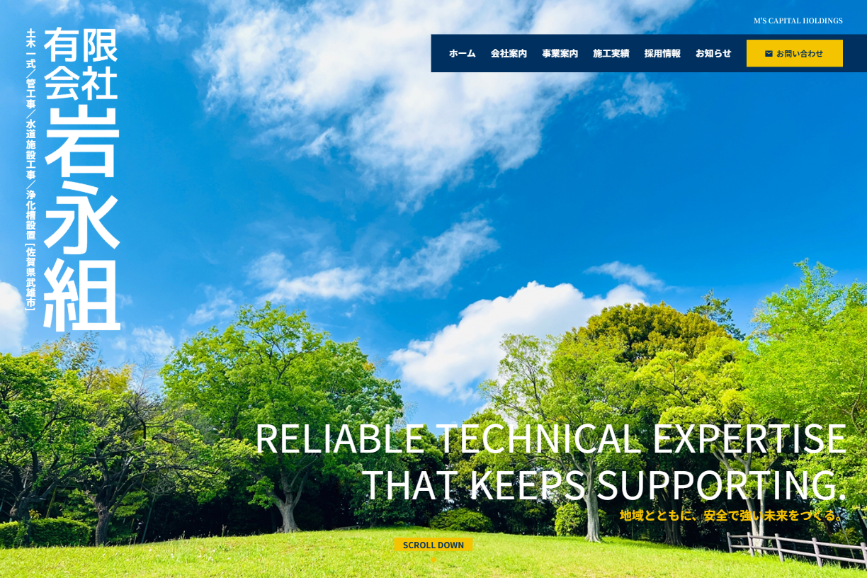 当社コメント佐賀県武雄市を拠点に、土木工事・管工事・上下水道設備工事を手がける株式会社岩永組様のウェブサイトを制作いたしました。