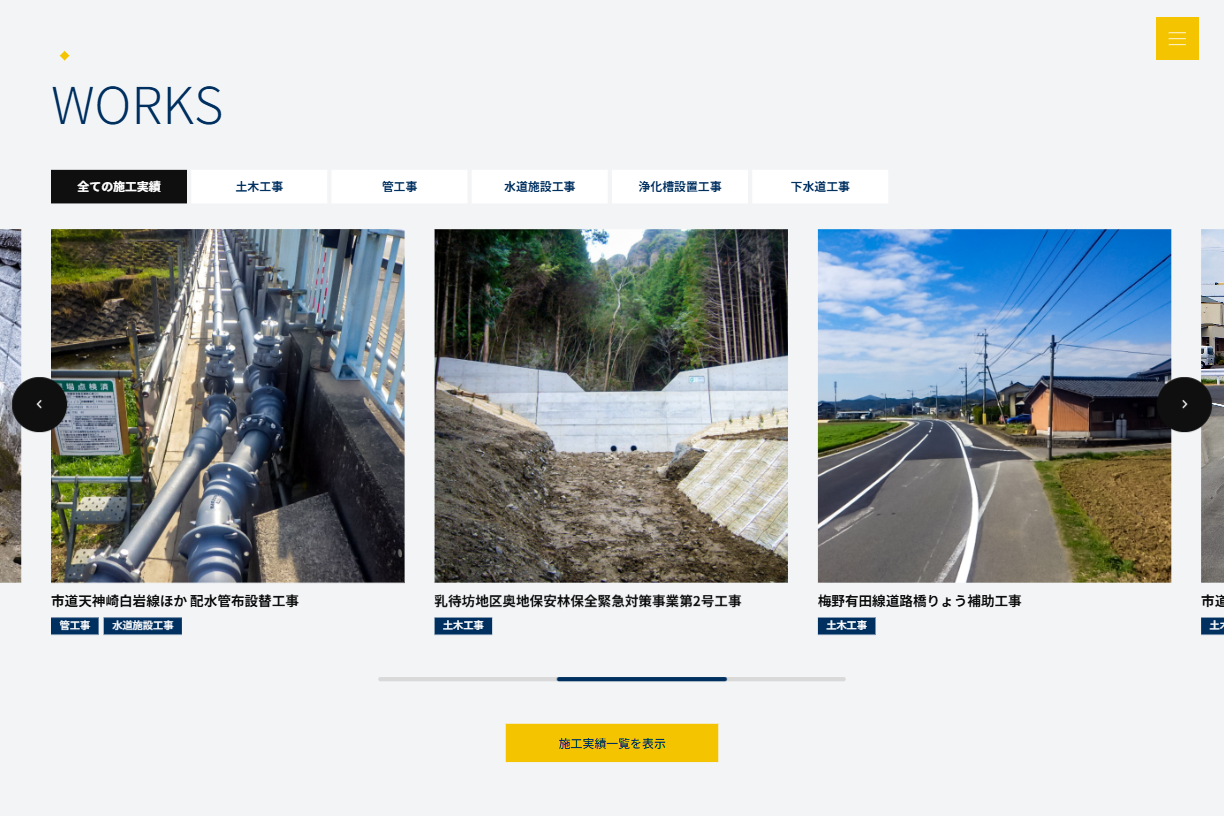 UI面では、「事業紹介」「施工実績」「会社案内」「採用情報」などの主要コンテンツを明確に分類し、目的に応じてスムーズにアクセスできる導線設計を採用。施工実績についてはカテゴリごとに整理することで、ユーザーが関心のある工事内容を探しやすく、実績の幅広さが伝わる構成としました。